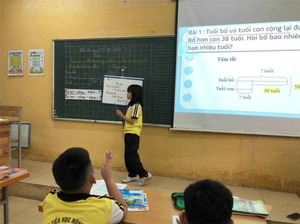 Sáng 25/10/2022, cô giáo Nguyễn Thị Ngọc Ánh cùng các con học sinh lớp 4B đã thực hiện tiết hội giảng môn Toán bài Tìm hai số khi biết tổng và hiệu của hai số đó. Đây là một kiến thức mới đối với học sinh lớp 4. Tuy nhiên với sự sáng tạo và chuyên môn chắc chắn của mình, cô giáo Nguyễn Thị Ngọc Ánh đã từng bước giúp học sinh biết cách phân tích đề bài, xác định số lớn, số bé, tổng và hiệu của hai số. Từ đó cô giáo đã hướng dẫn học sinh các bước giải bài toán và trình bày bài giải. Sau tiết học, học sinh đã nắm được cách giải bài toán Tìm hai số khi biết tổng và hiệu của hai số đó. Một số em đã mạnh dạn trình bày bài làm của mình trước lớp.