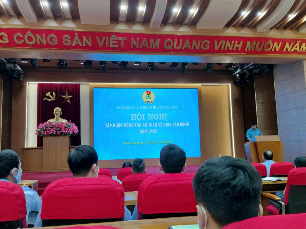 sáng ngày 25 tháng 10 năm 2022 tại hội trường Huyện ủy, LĐLĐ huyện Gia Lâm tổ chức Hội nghị tập huấn công tác An toàn vệ sinh lao động năm 2022