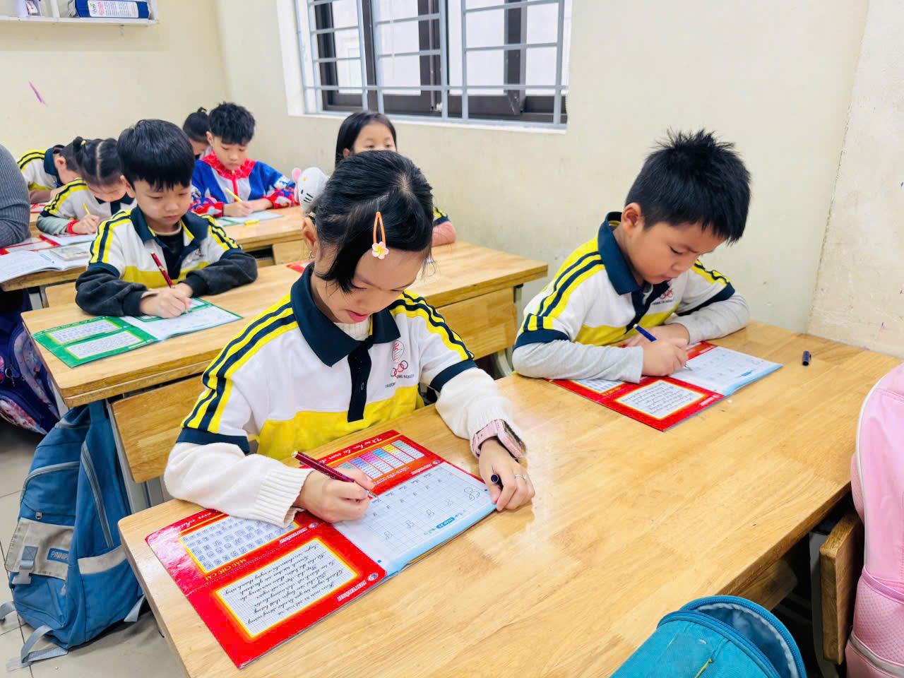 Bên cạnh đó, nội dung viết câu ứng dụng cũng được chú trọng. Cô giáo hướng dẫn học sinh cách viết chữ hoa S trong câu, liên kết chữ đúng quy định, đảm bảo độ đều, khoảng cách giữa các chữ và các tiếng. Học sinh lớp 2A5 tích cực tham gia luyện tập, nhiều em viết chữ rõ ràng, ngay ngắn, thể hiện sự tiến bộ trong kỹ năng viết.