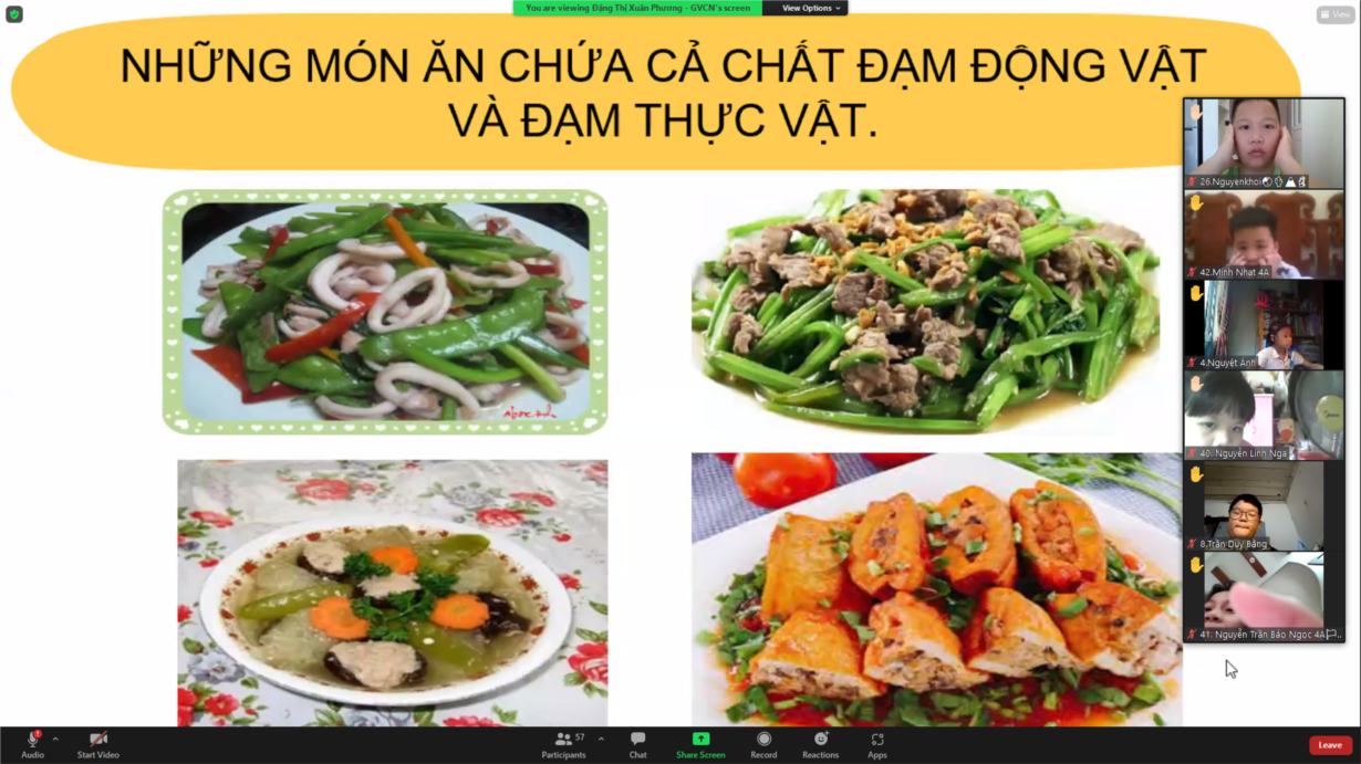 Tham dự chuyên đề Khoa học lớp 4 có BGH nhà trường cùng các đồng chí giáo viên trong tổ 4. Với lòng nhiệt tình và kinh nghiệm dạy lớp 4 nhiều năm liền cùng với khả năng ứng dụng CNTT của mình, cô giáo Đặng Thị Xuân Phương đã từng bước hướng dẫn học sinh tham gia vào bài học “Tại sao cần ăn phối hợp đạm động vật và đạm thực vật". Các em học sinh lớp 4A đã tích cực và hứng thú khám phá kiến thức mới để htrong mâm cơm hàng ngày, những loại thức ăn nào cung cấp đạm thực vật, đạm động vật, tại sao cần ăn phối hợp đạm thực vật, đạm động vật, rồi tại sao chúng ta nên ăn nhiều cá…. Một phần không thể thiếu trong tiết học là phần chia sẻ các loại thức ăn trong mâm cơm thường ngày của gia đình học sinh. Cô giáo Đặng Thị Xuân Phương đã giúp các con trải nghiệm môn học bằng cách chia sẻ những kiến thức của bài học qua việc giới thiệu mâm cơm của gia đình mình. Từ đó liên hệ thực tế phù hợp với nội dung cũng như khả năng của học sinh. Mặc dù tiết học thực hiện theo hình thức trực tuyến qua phần mềm Zoom nhưng cả cô và trò đều rất cố gắng đạt được mục tiêu của bài. Xin chúc cô giáo Đặng Thị Xuân Phương và các con học sinh lớp 4A dồi dào sức khỏe để vượt qua đại dịch và sớm trở lại trường học.