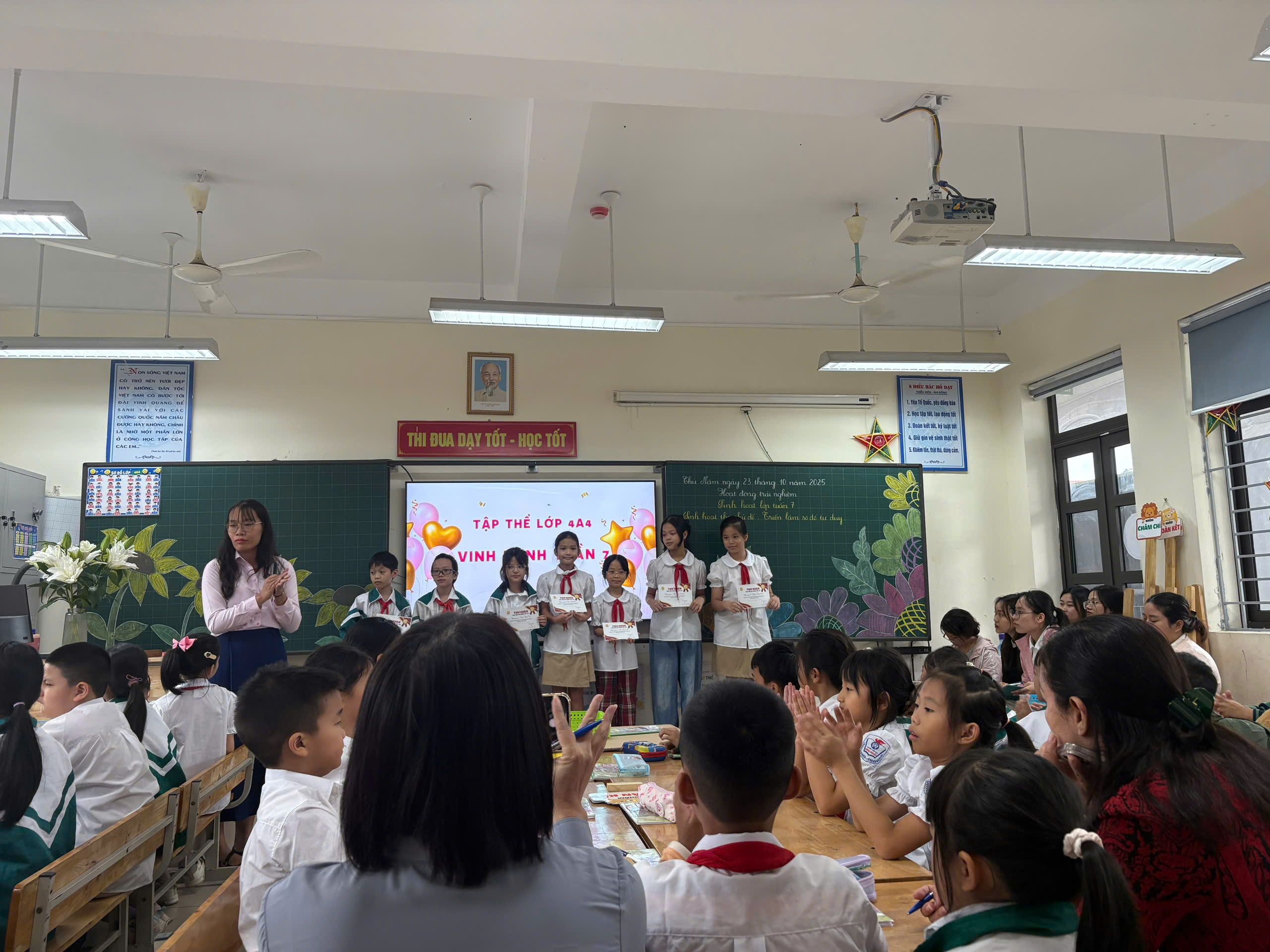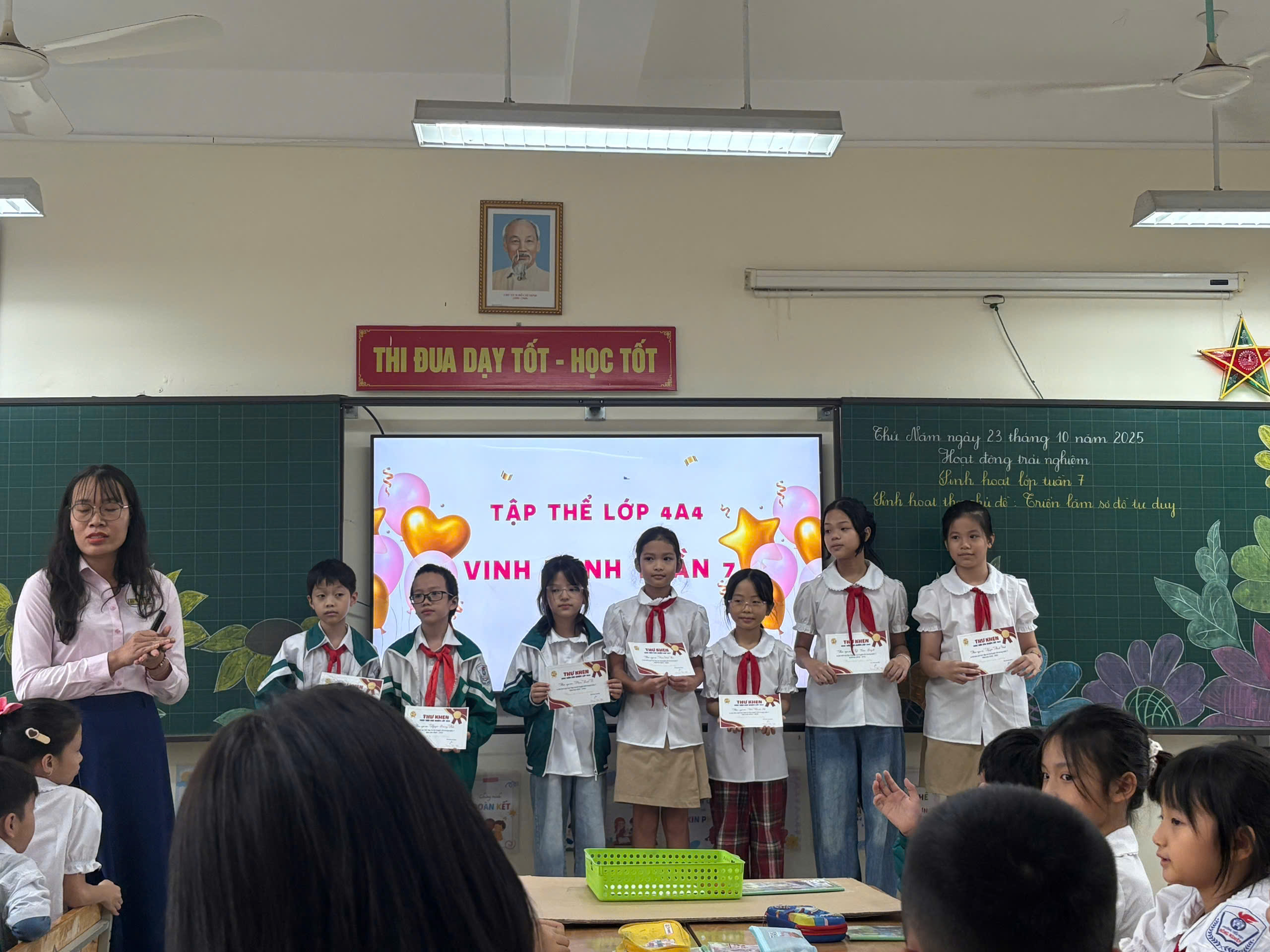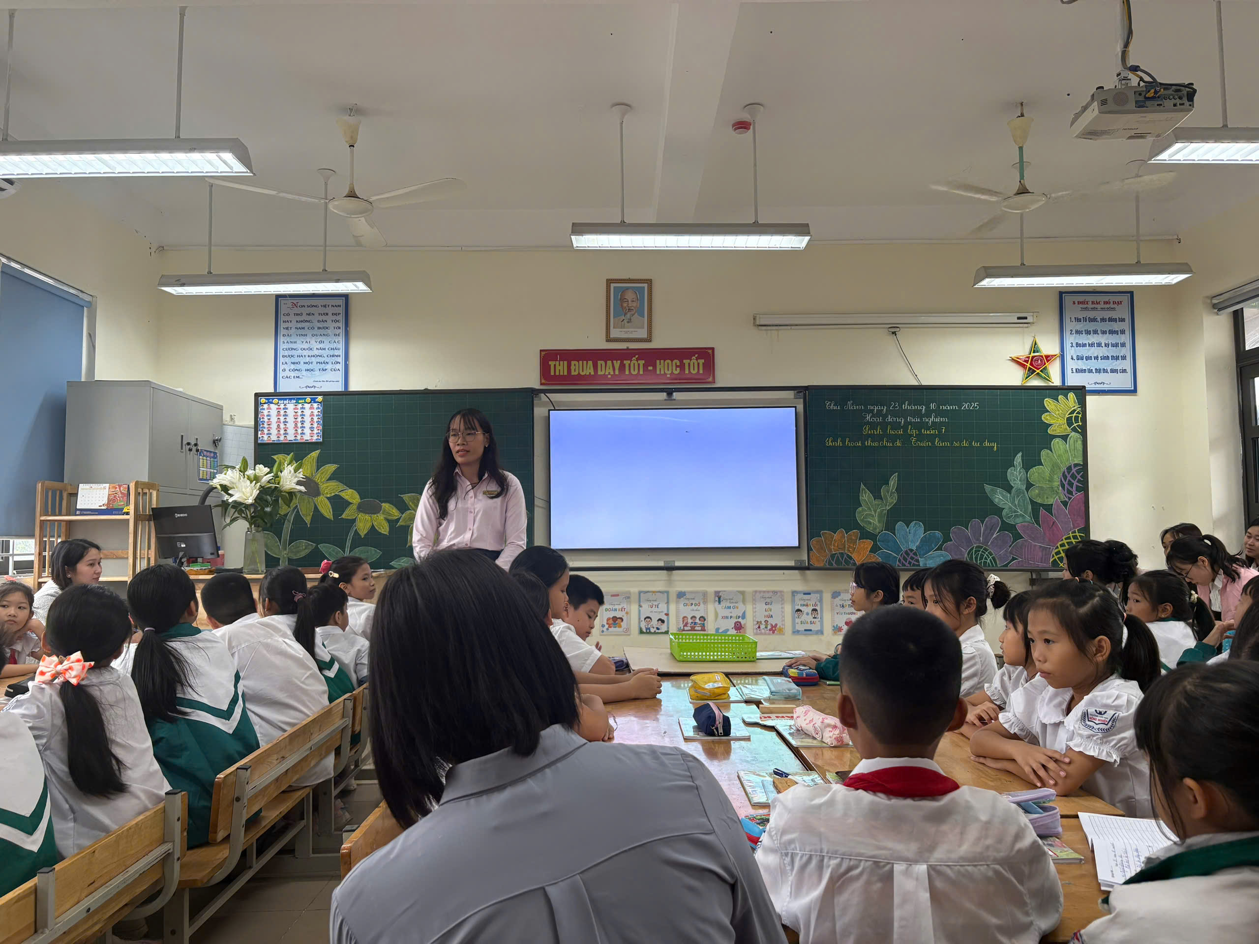 Cũng trong sáng ngày 23 tháng 10 năm 2025, cô giáo Dương Thu Hà đã thực hiện tiết Hội giảng môn Hoạt động trải nghiệm – Tuần 7: Bài Sinh hoạt lớp tuần 7 tại lớp 4A4, với sự tham gia của 49 học sinh.