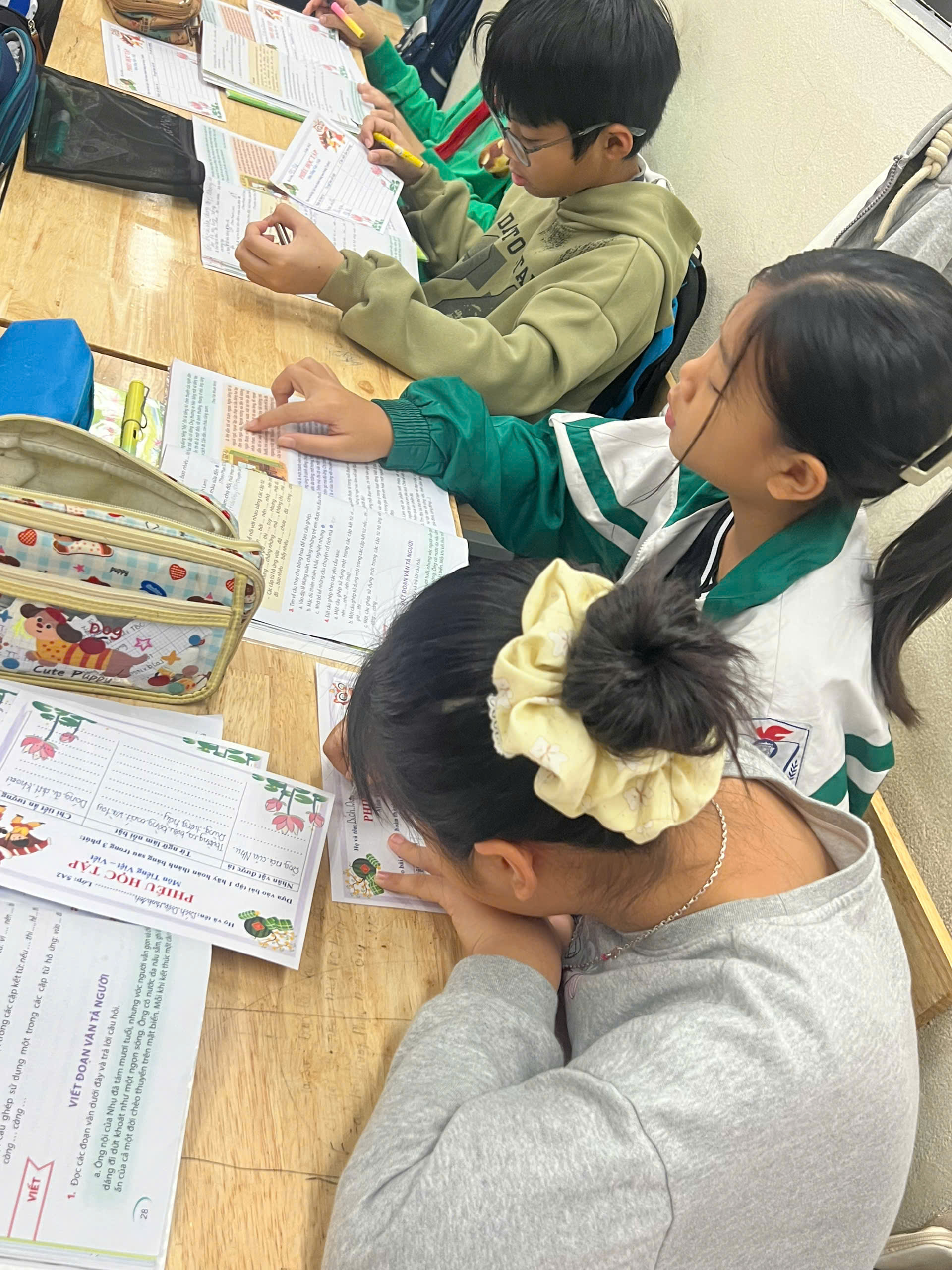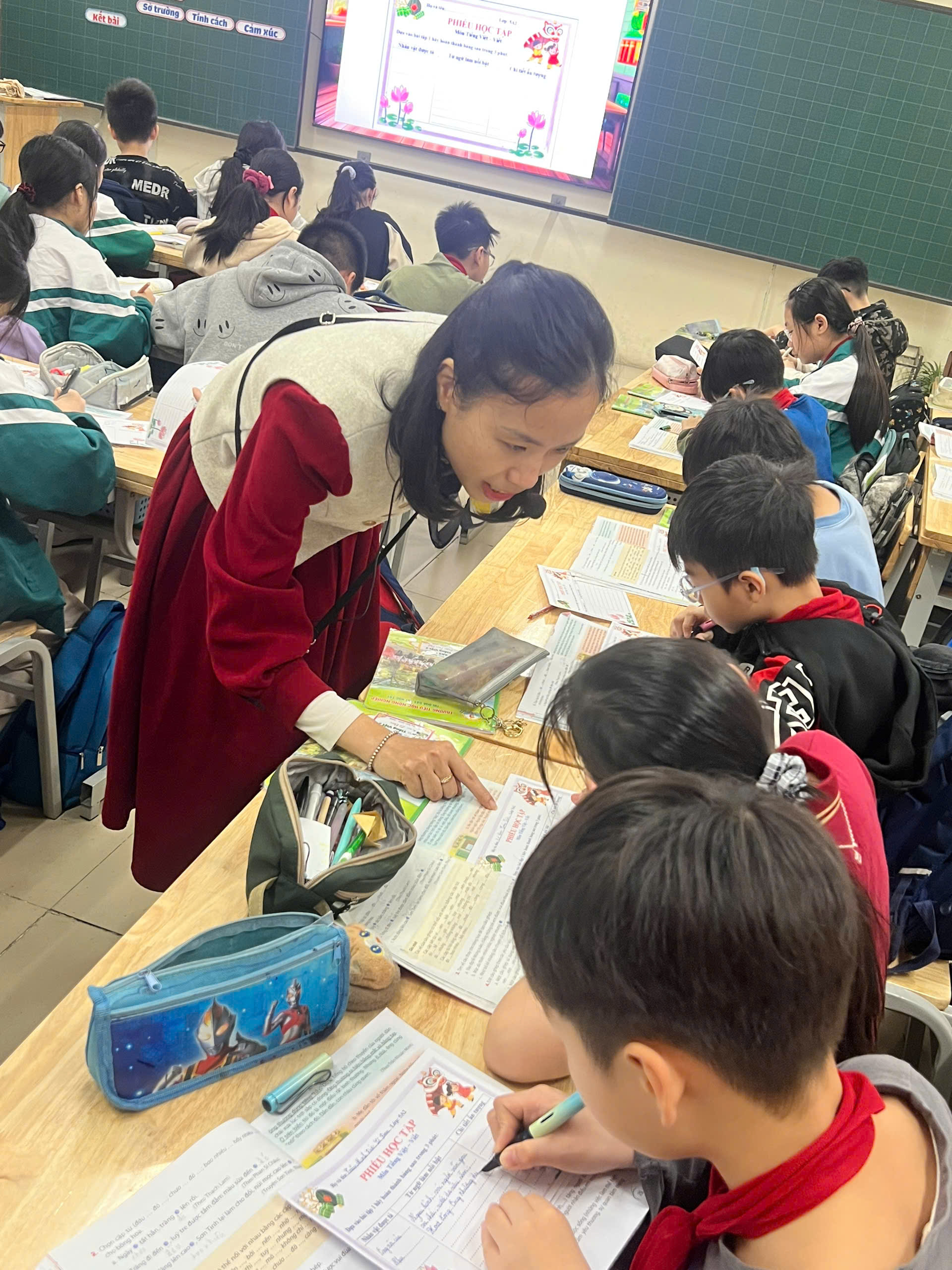 Tiết học được tổ chức khoa học, sinh động, chú trọng phát huy kỹ năng thảo luận nhóm nhằm giúp học sinh tìm hiểu các đoạn văn mẫu, từ đó nắm vững cấu tạo của đoạn văn tả người. Dưới sự hướng dẫn của cô giáo, học sinh được chia nhóm, cùng nhau đọc, trao đổi và thảo luận để xác định các nội dung chính trong đoạn văn như: đối tượng được miêu tả, các chi tiết tiêu biểu về ngoại hình, tính cách, hoạt động và tình cảm của người viết.