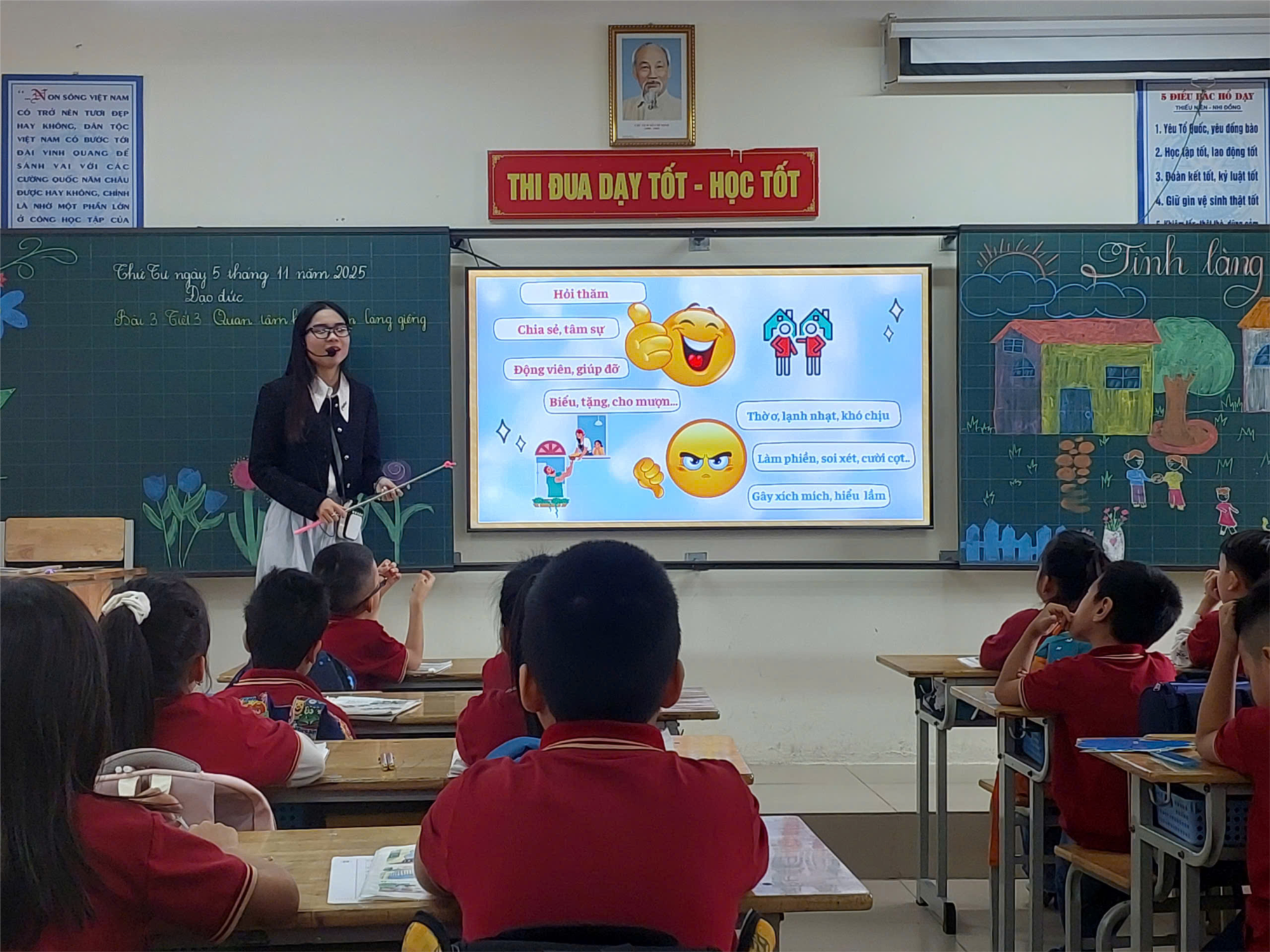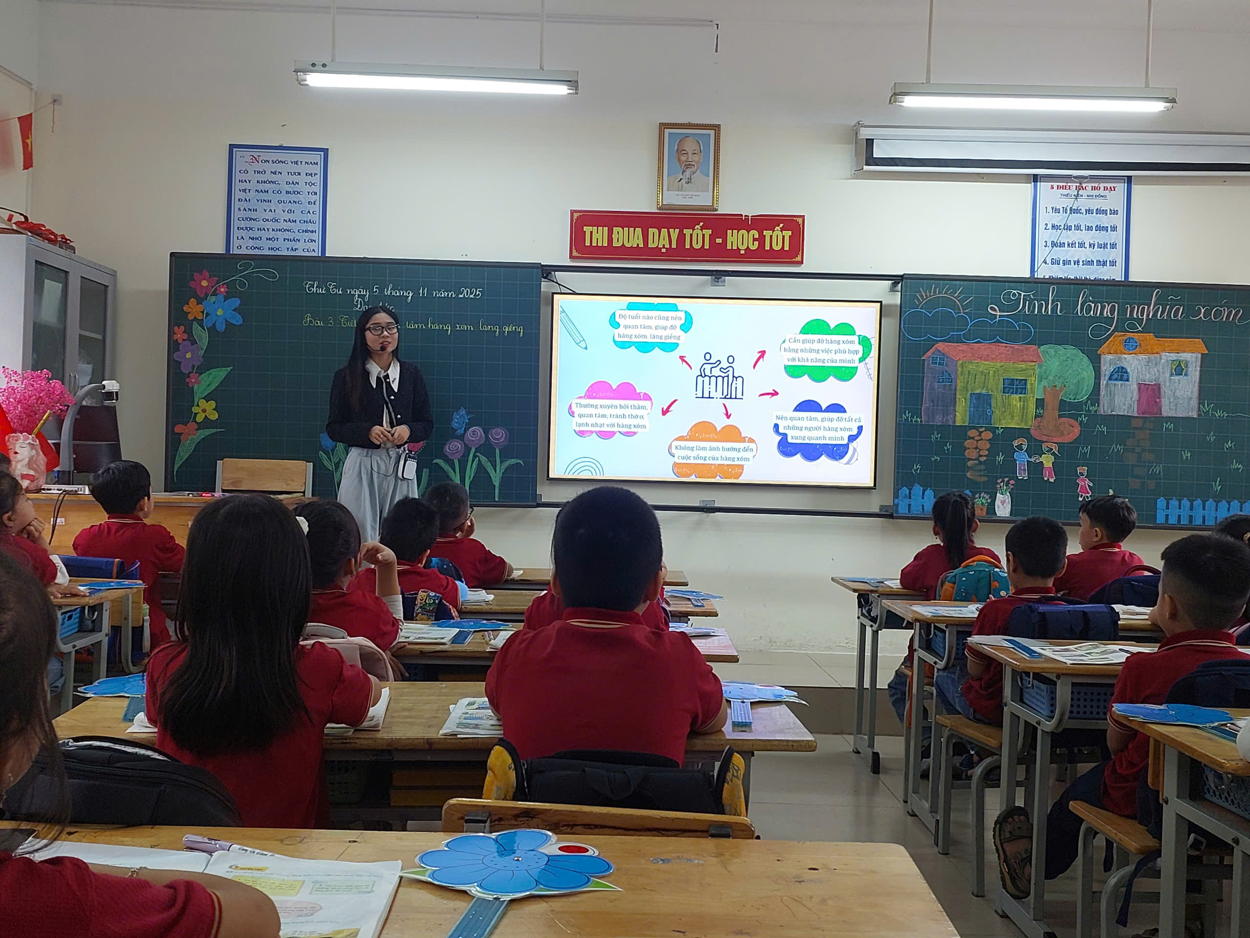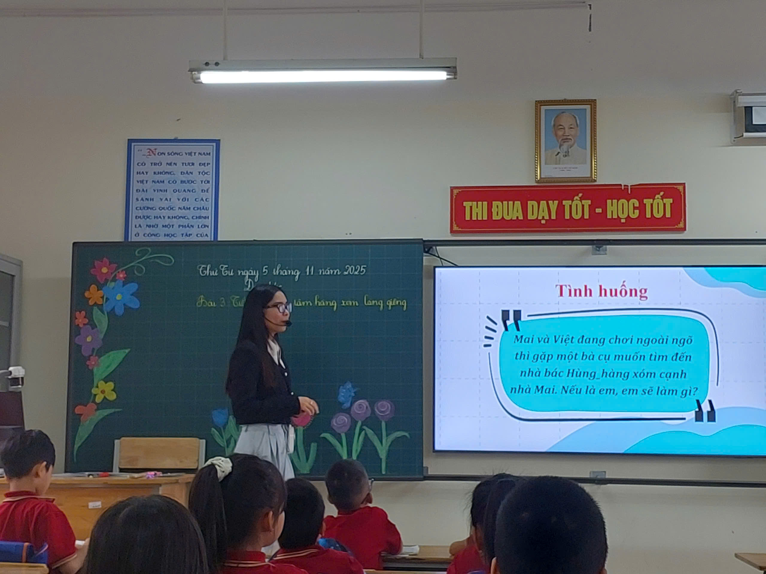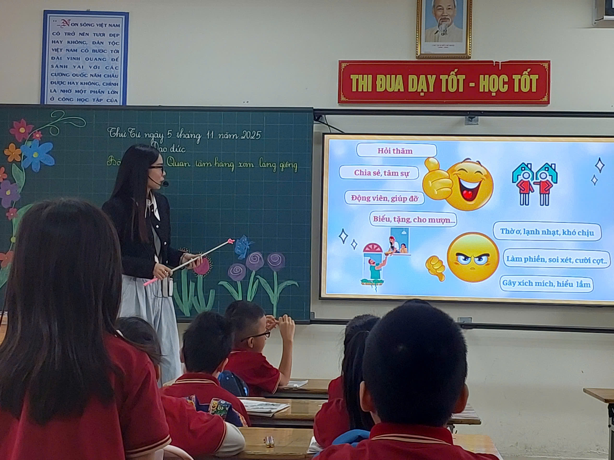 Sáng ngày 05/11/2025, cô giáo Nguyễn Thùy Dương đã thực hiện tiết Hội giảng môn Đạo đức – Bài 3. Tiết 3. Quan tâm hàng xóm láng giềng với sự tham gia của hơn 40 học sinh lớp 3A5. Đến dự tiết Hội giảng có các thầy cô trong Ban giám khảo, cùng các thầy cô trong tổ chuyên môn khối 3. Xin chúc mừng cô trò lớp 1A3 đã hoàn thành xuất sắc tiết Hội giảng.
