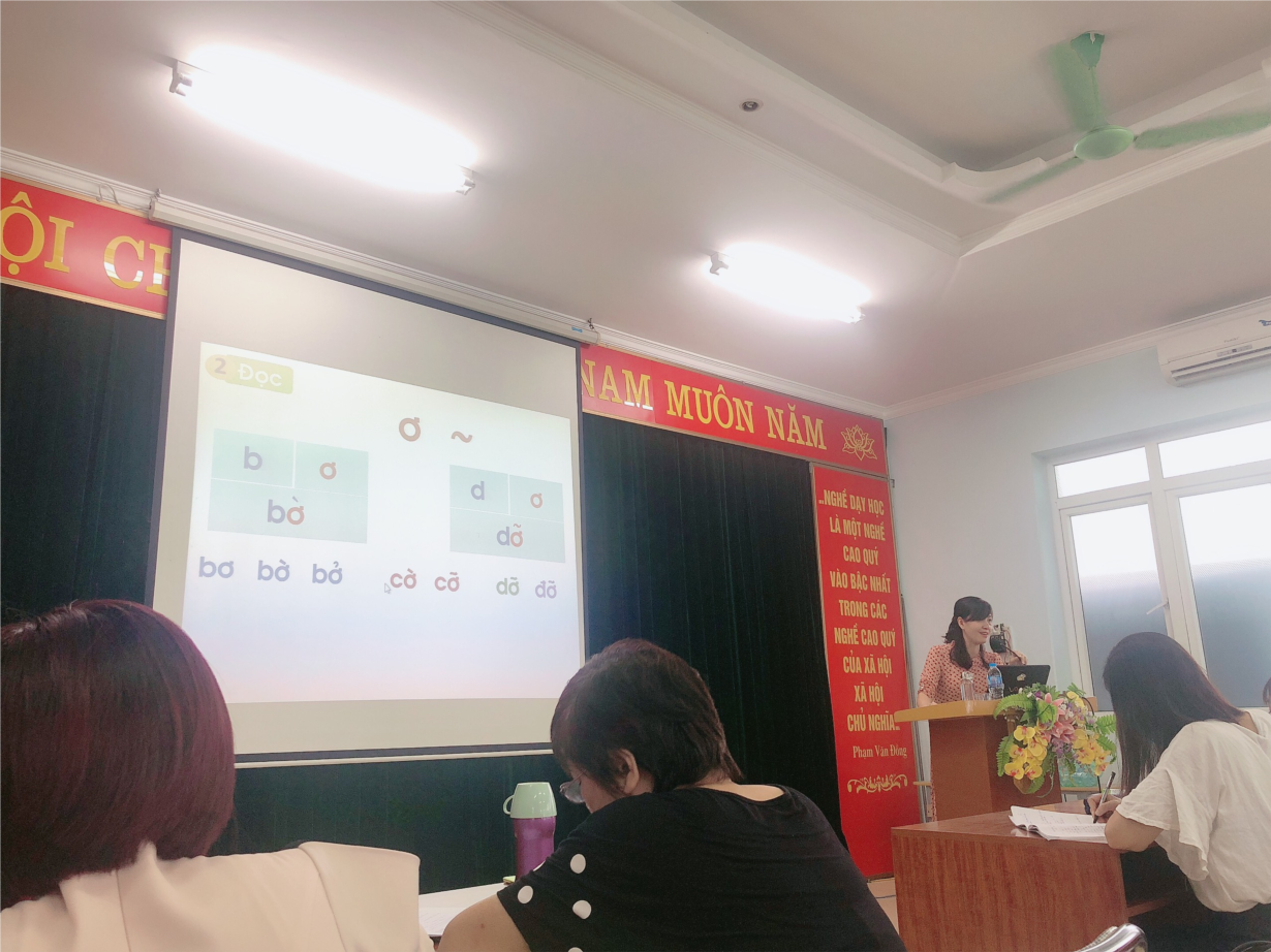 Thực hiện giấy mời số 48/GM-GD&DT ngày 03/8/2020 của PGD &ĐT huyện, ngày 04/8/2020, CB, GV trường Tiểu học Nông nghiệp tham gia tập huấn môn Tiếng Việt lớp 1 theo chương trình GDPT 2018. Trong buổi tập huấn, bằng sự tâm huyết và sáng tạo của bản thân và sự đồng hành của GV tổ 1, cô giáo Đỗ Thị Hoàng Mai đã đại diện cho GV khối 1 lên thuyết trình bài 9, tiết 1, Sách TV lớp 1, tập 1. Bài thuyết trình được GS.TS Lê Phương Nga cùng GV khối 1 toàn huyện đánh giá cao.