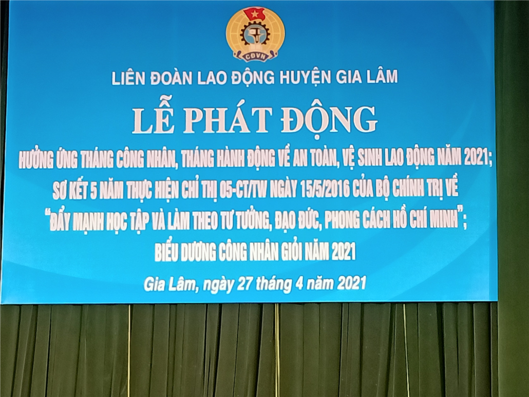 Sáng ngày 27/04/2021, LĐLĐ huyện Gia lâm tổ chức Lễ phát động: Hưởng ứng tháng công nhân, tháng hành động về vệ sinh an toàn, vệ sinh lao động năm 2021; Sơ kết 05 năm thực hiện Chỉ thị 05-CT/TW ngày 15/05/2016 của Bộ Chính trị về “Đẩy mạnh học tập và làm theo tư tưởng, đạo đức, phong cách Hồ Chí Minh”; Biểu dương công nhân giỏi năm 2021.