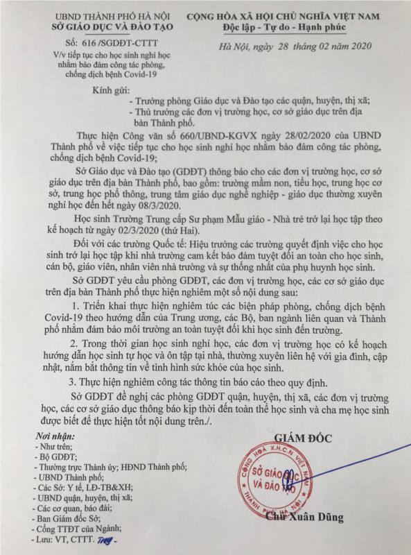 Thực hiện Công văn số 616/SGDĐT-CTTT ngày 28/2/2020 của Sở GD&ĐT Hà Nội, Công văn số 60/GDĐT ngày 28/2/2020 của PGD&ĐT Gia Lâm về việc tiếp tục cho học sinh nghỉ học nhằm đảm bảo công tác phòng, chống dịch bệnh viêm phổi cấp do Covid-19 gây ra, BGH trường TH Nông Nghiệp thông báo HS tiếp tục được nghỉ học từ ngày đến hết ngày 08/3/2020. Ngày 09/3/2020, các em HS quay trở lại học bình thường. Trong thời gian HS được nghỉ học, cha mẹ học sinh quản lý, chăm sóc các con ở nhà, hướng dẫn con thực hiện các biện pháp tự bảo vệ mình trước diễn biến phức tạp của dịch bệnh, hướng dẫn học sinh tự học và ôn tập tại nhà; thường xuyên liên hệ với GVCN để thông tin về tình hình sức khoẻ của các con cho GV.