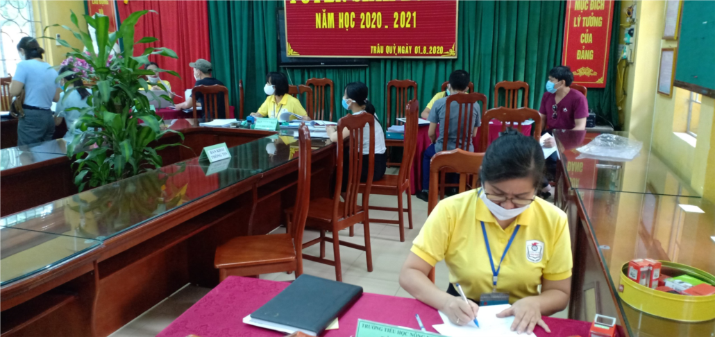 Thực hiện kế hoạch tuyển sinh năm học 2020 - 2021, sáng ngày 01/8/2020, trường Tiểu học Nông Nghiệp tổ chức hỗ trợ phụ huynh tuyển sinh lớp 1 trực tuyến năm học 2020 - 2021. Ban tuyển sinh nhà trường đã thực hiện đo thân nhiệt và nhắc phụ huynh đeo khẩu trang và sát khuẩn tay trước khi vào phòng tuyển sinh.