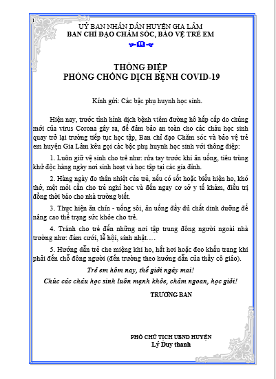 Hiện nay, trước tình hình dịch bệnh viêm đường hô hấp cấp do chủng mới của virus Corona gây ra, để đảm bảo an toàn cho các cháu học sinh quay trở lại trường tiếp tục học tập, Ban chỉ đạo Chăm sóc và bảo vệ trẻ em huyện Gia Lâm kêu gọi các bậc phụ huynh học sinh với thông điệp: