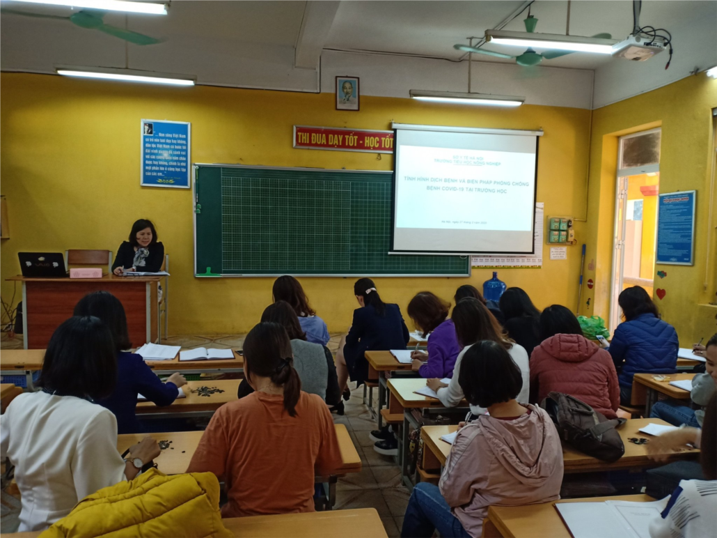 Thực hiện sự chỉ đạo của Trung tâm y tế huyện Gia Lâm và PGD ĐT huyện, sáng 27/2/2020, trường TH Nông Nghiệp tổ chức buổi Tuyên truyền, tập huấn phòng dịch Covid – 19. Dưới sự điều hành của đồng chí Trần Thị Hương Lan – Hiệu trưởng nhà trường và đồng chí Đào Thu Hồng – CB y tế, toàn bộ cán bộ, giáo viên, nhân viên nhà trường được tìm hiểu về bệnh viêm đường hô hấp cấp do virus nCoV chủng mới của vi rút co – ro – na và về cách phòng bệnh. Những kiến thức và kĩ năng thu thập trong buổi tuyên truyền tập huấn hôm nay sẽ góp phần giúp tập thể CB, GV, NV nhà trường biết cách phòng chống dịch bệnh cho bản thân và gia đình. Đặc biệt trong buổi tuyên truyền, nhà trường cũng đã lên các phương án thực hiện trước và trong quá trình đón học sinh trở lại trường vào ngày 2/3/2020.